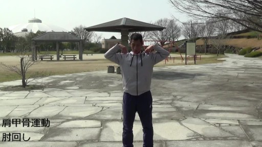 肘を回す種目では体幹部が肘と同じ動きをしないよう常に正面を向いたまま